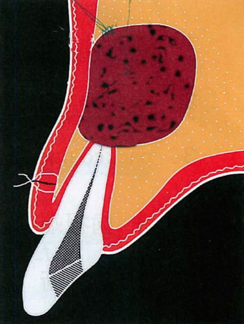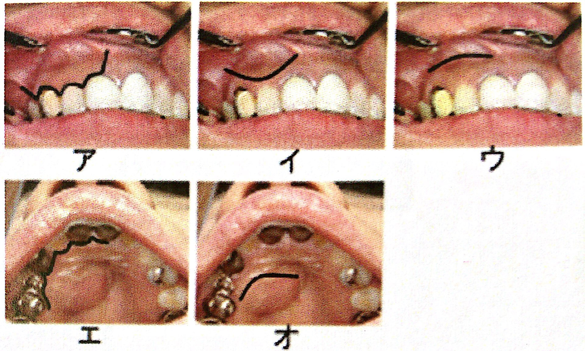 また、新作2のほうは、摘出閉鎖術なので、ア=バスムンド切開とイ=パルチ切開、どちらも適用なはずですが、歯肉縁から、5mm以上切開線が取れない場合は、パルチ切開線をすると血流が取れなくなるため、バスムンド切開をおこなうことになります。バスムンド切開は、歯肉退縮のリスクがあります。