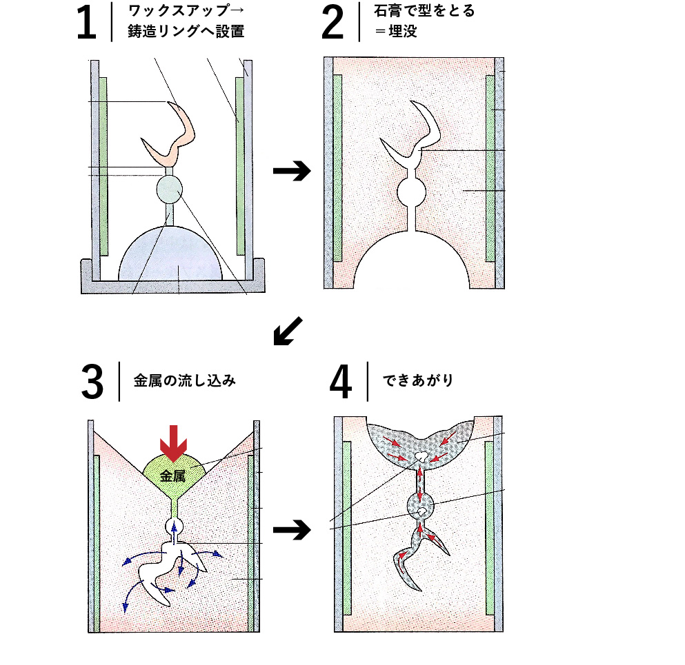 まず最初に、鋳造の基本的な流れを押さえていきましょう。 下のイラストの4段階で説明していきます。