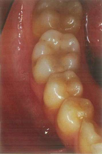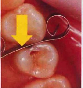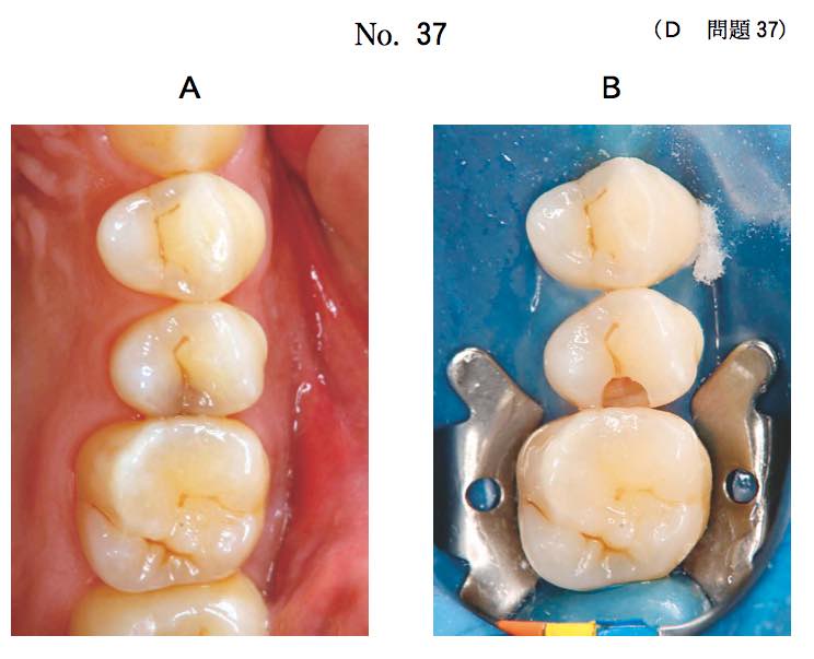 34歳の女性。下顎右側第一大臼歯の冷水痛を主訴として来院した。2週前から一過性の冷水痛を自覚するようになったという。電気診に正常に反応する。コンポジットレジンで修復することとした。初診時のエックス線写真と感染象牙質除去後の口腔内写真とを別に示す。