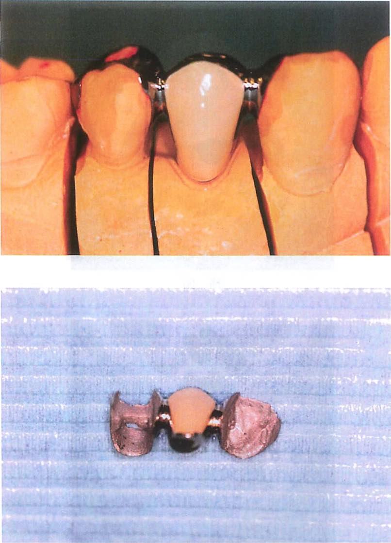 65歳の男性。上顎前歯部の審美障害を主訴として来院した。レジン前装冠によるブリッジを製作することとした。支台歯形成後の口腔内写真と技工中の咬合器の写真とを別に示す。
