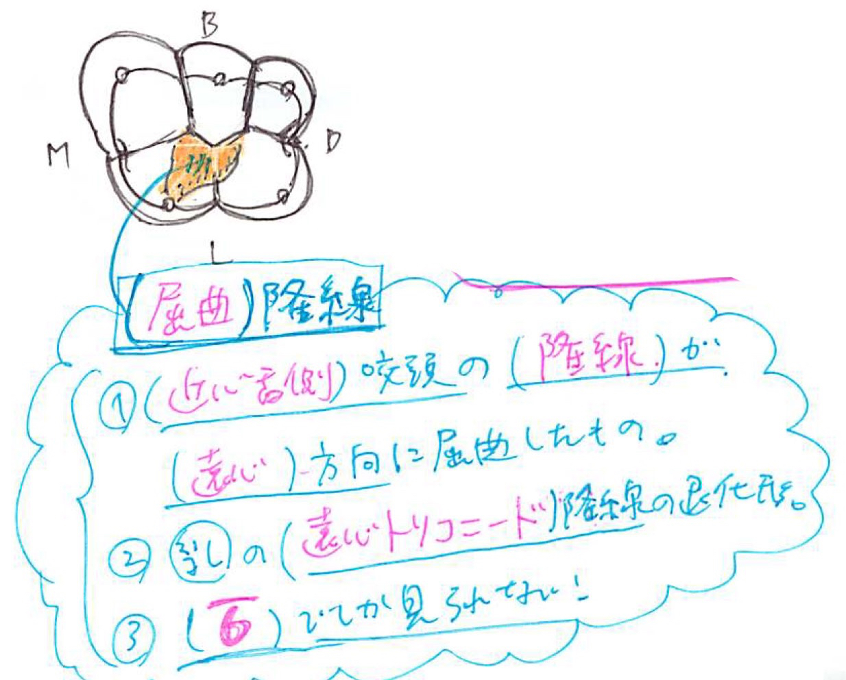 下顎6には屈曲隆線があります。上顎6では、斜走隆線でしたね。こちらも確実に覚えておきましょう。