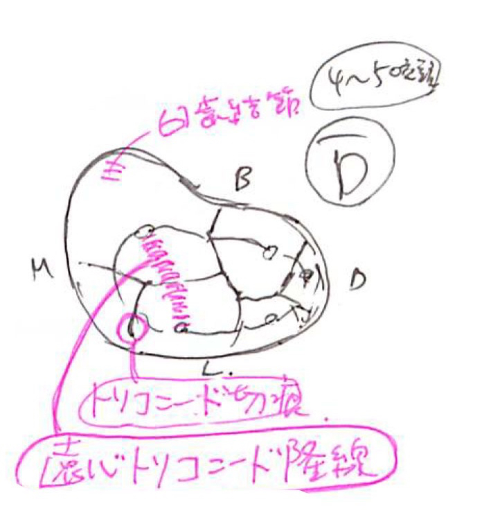 トリゴニード切痕は舌側から眺めた時、近心舌側咬頭と、近心辺縁隆線との間にある、深い溝です。ここはどういうわけかすごく深く切痕ができています。近心舌側咬頭と遠心舌側咬頭の間にも溝がありますが、これよりもずっと深いです。これが特徴的なので、「トリゴニード切痕」と名前をつけています。